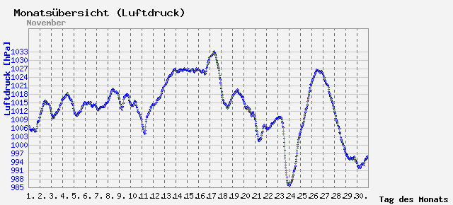 Schnitt: 1013.25 hPa; Min: 985.6 hPa; Max: 1033.2 hPa