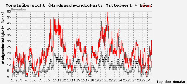 Die letzte Spalte zeigt die Qualität der Funkverbindung zu den Außensensoren an: "?" deutet Schwierigkeiten bei der Datenübertragung an. Die Daten wurden aber vollständig übertragen! "!" zeigt an, dass mindestens ein Datensatz nicht übertragen wurde und in die Mittelung nicht einbezogen werden konnte (D.h. von mind. einer halben Stunde fehlen alle Werte !).