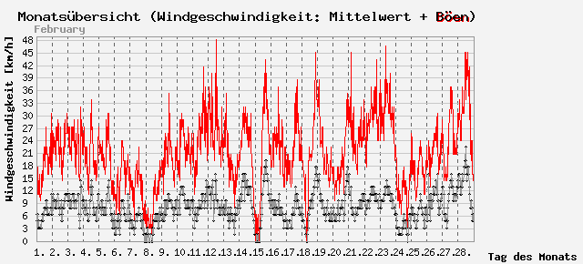 Die letzte Spalte zeigt die Qualität der Funkverbindung zu den Außensensoren an: "?" deutet Schwierigkeiten bei der Datenübertragung an. Die Daten wurden aber vollständig übertragen! "!" zeigt an, dass mindestens ein Datensatz nicht übertragen wurde und in die Mittelung nicht einbezogen werden konnte (D.h. von mind. einer halben Stunde fehlen alle Werte !).